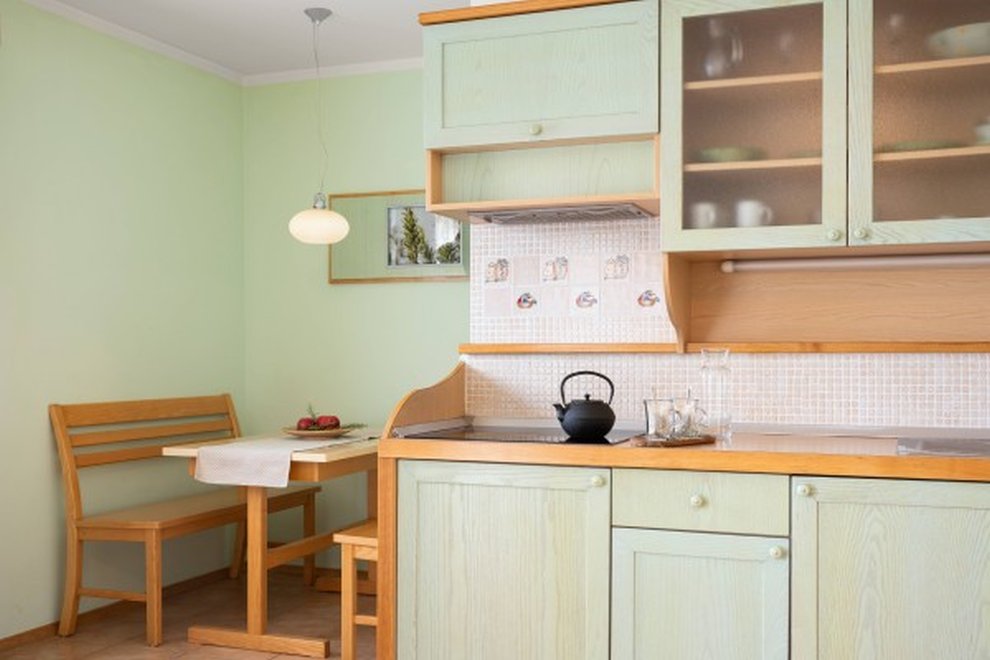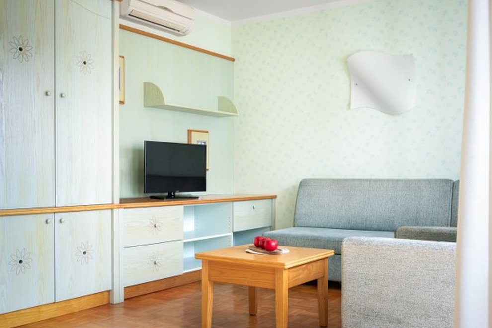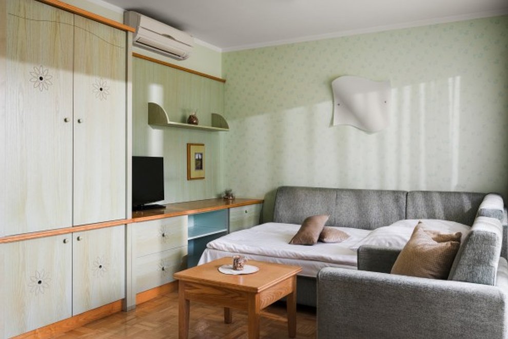 Apartmán A4 - apartmán 2+2 (45 m²) ložnice, obývací pokoj s kuchyní a rozkládací postelí, koupelna, balkon. Nábytek z přírodního jasanového dřeva.