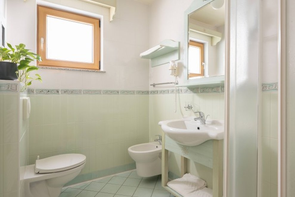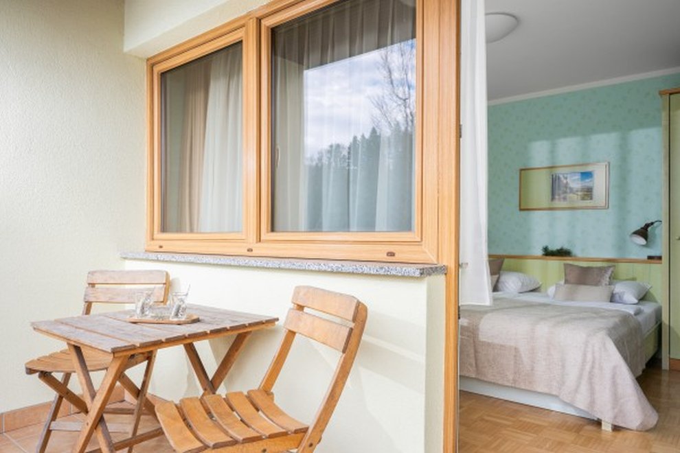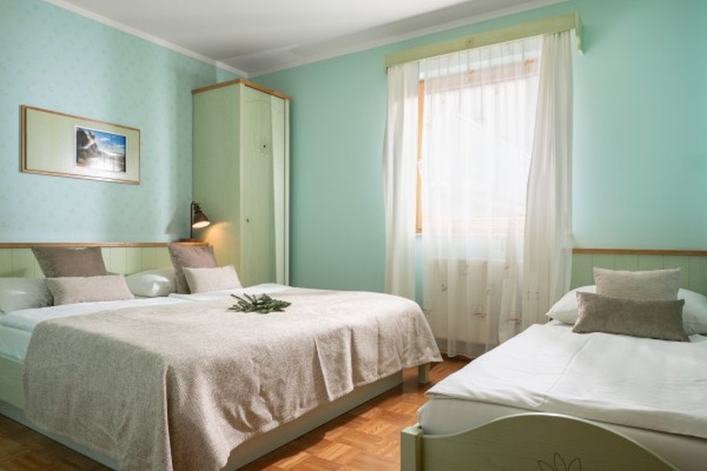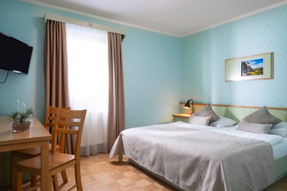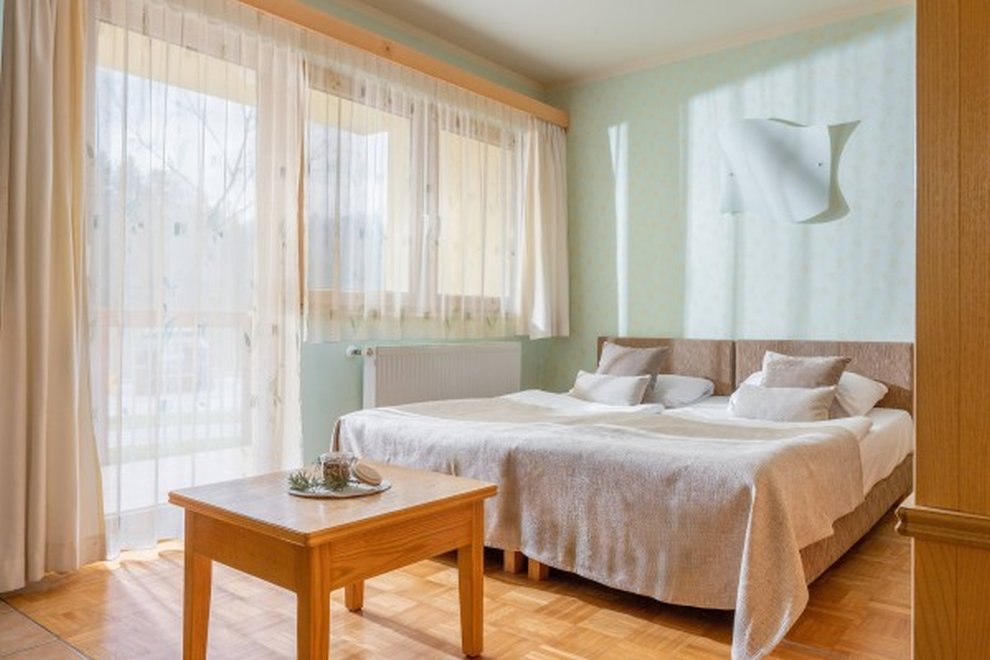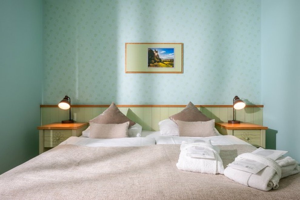 2lůžkový pokoj (24 m2) ložnice s pohodlnou postelí, vlastní koupelna, některé pokoje s balkonem. Nábytek z přírodního jasanového dřeva.